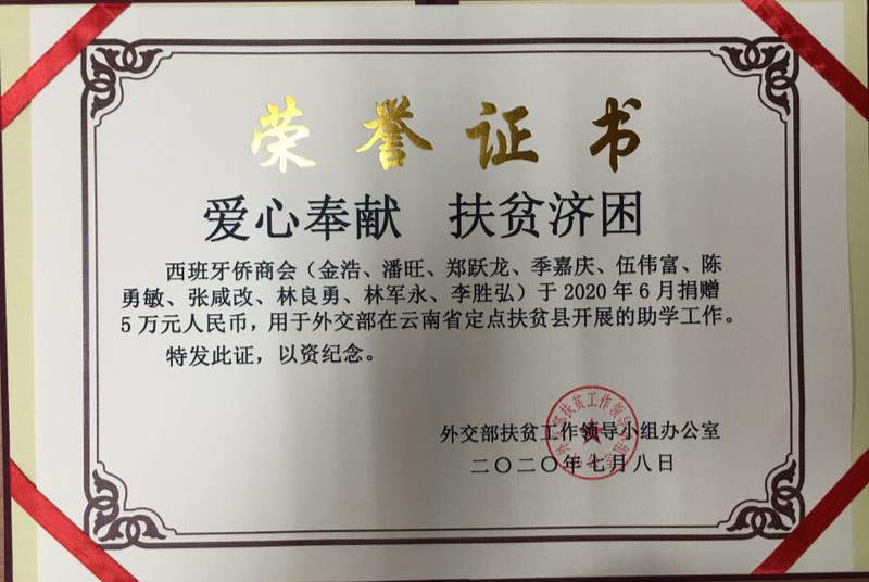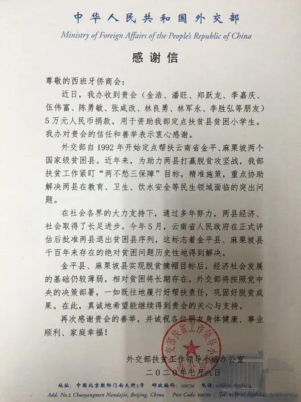 为感谢西班牙侨商会善举,7月8日,外交部扶贫办特书感谢信一封,对商会帮扶贫困县善举表示感谢。西班牙侨商会将一如既往支持外交部扶贫工作,履行好帮扶责任、巩固好脱贫成果,为帮助更多贫困县经济社会发展助力。
