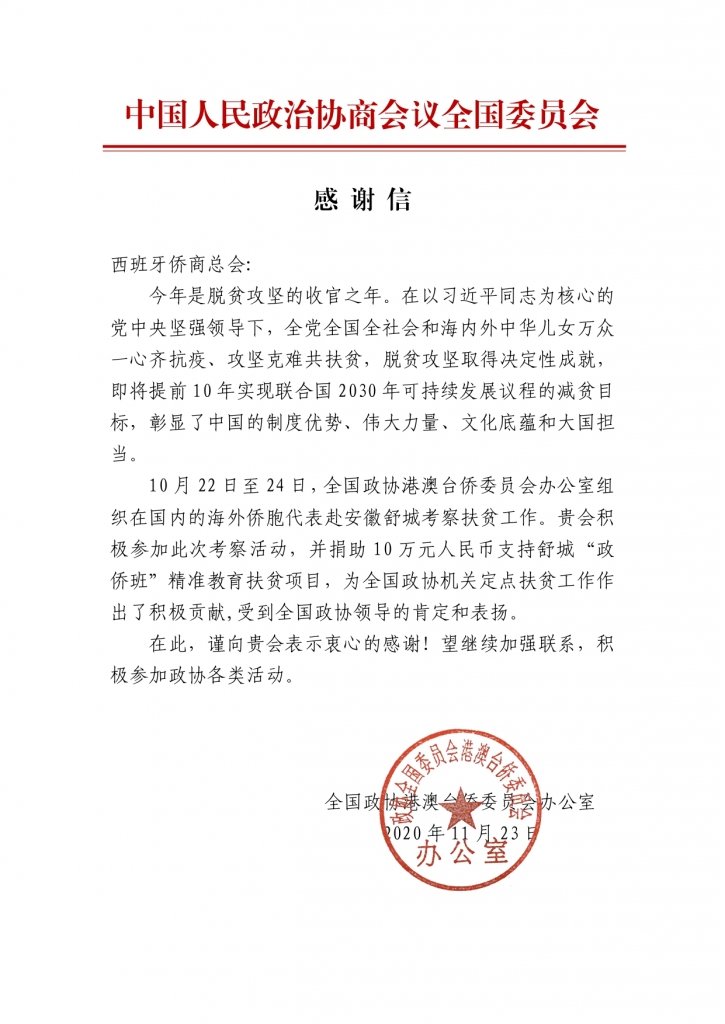 11月27日,中国人民政治协商会议全国委员会向西班牙侨商总会发来一封感谢信,感谢西班牙侨商总会在此前全国政协港澳台侨委员会办公室组织的安徽舒城扶贫工作中的积极贡献。